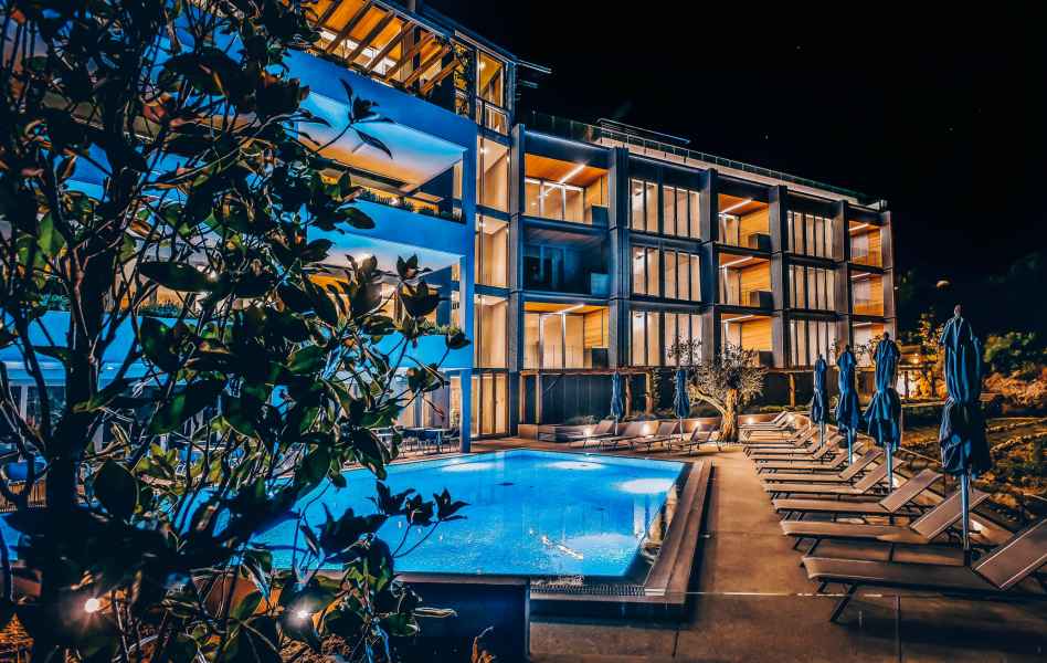 This luxurious and prestigious complex is at 80-meters distance from the sea, with an astonishing view overlooking the Bay of Milocer. A stone wall is erected according to the traditional building method, symbolizing protection, and provides a contrast to light, mobile, aluminum facade panels providing protection from the sun and also opening towards the best views. All residential units with their amenities have a sea view. The apartments at the bottom floor have terraces with green areas and verandas with climber plants making a shade spreading over pergolas. Green shrubs are to be planted within green areas that will enable maximum intimacy of certain terraces, and also olive trees as a symbol of the Mediterranean.